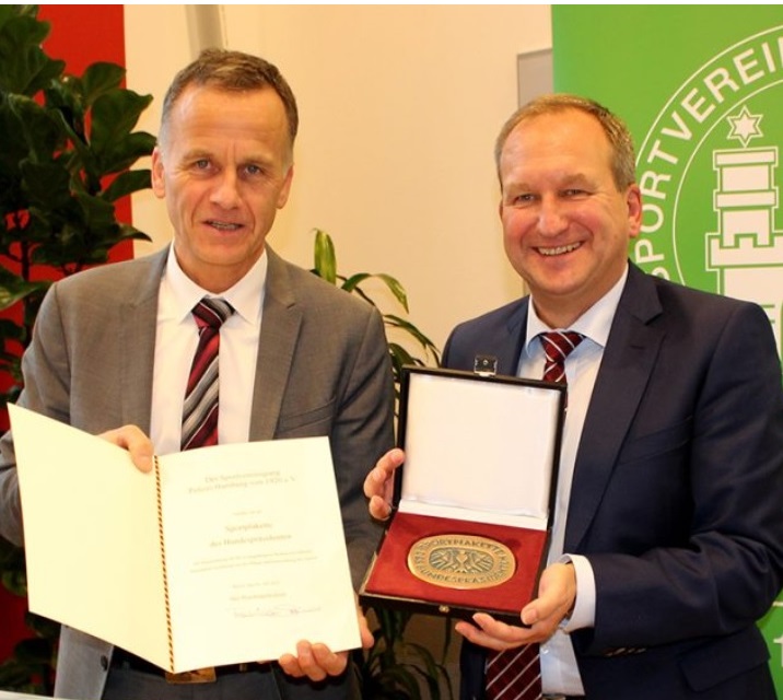 (v. l.) Stellvertretend verlieh Christoph Holstein, Staatsrat der Behörde für Inneres und Sport, Bereich Sport, die Sportplakette des Bundespräsidenten an Karsten Witt, Präsident der Sportvereinigung Polizei Hamburg von 1920 e. V.
